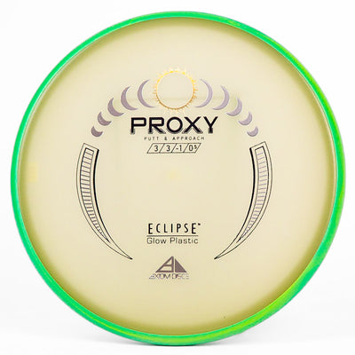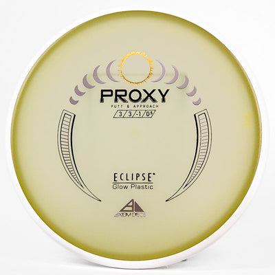 The Axiom Eclipse Proxy is a stable to understable putt & approach disc made with glow in the dark plastic. Axiom's Eclipse 2.0 Glow is hands down the brightest glowing plastic currently on the market. It not only is extremely bright, but it also holds a charge longer than any other glow plastic I have tested. If you are looking for a beginner friendly understable approach disc for your next night round then definitely check out the Axiom Glow Proxy in Eclipse 2.0 plastic!
