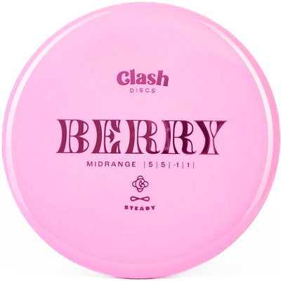 The Clash Discs Berry (Steady) is a beginner-friendly disc golf midrange that is a straight-flyer and very versatile. Clash's Steady plastic is their premium plastic blend that can take damage well and has a gummy feeling grip. This is the perfect midrange for brand new players to learn with as it will literally do whatever you want it too. The Berry can hold an anhyzer line, hyzer flip, fly dead straight, or anything else you need it to do. You can't go wring with a Clash Discs Steady Berry!