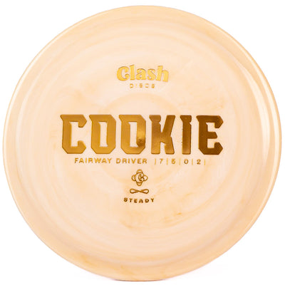 The Clash Discs Steady Cookie is a straight-to-stable fairway driver that offers a consistent and reliable flight path. Designed with just enough torque resistance, this disc is perfect for both backhand and forehand players. Made from premium Steady plastic, it provides a flexible, grippy, and durable feel. With flight numbers of 7/5/0/2, the Steady Cookie holds different lines easily and offers great control.