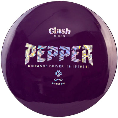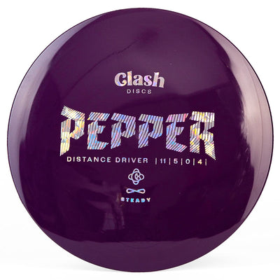 The Clash Discs Pepper (Steady) is a very overstable disc golf distance driver best suited for advanced players with lots of arm speed. If you have very fast, developed arm speed then the Clash Pepper will be your new go-to driver for headwinds and far dogleg left lines off the tee.