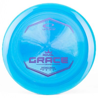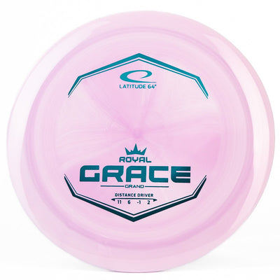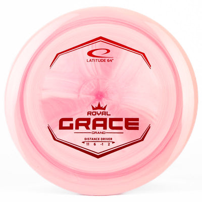 The Latitude 64 Grace (Royal Grand) is a slightly overstable disc golf distance driver made with premium plastic and is excellent for intermediate players. The Royal Grand Grace has some slight turn when thrown fast and then transitions to a forward fading finish at the end of its flight. It's not hard to get a good amount of distance if you don't have the fastest arm in the world, so give the Latitude 64 Royal Grand Grace a shot if you need an excellent driver!