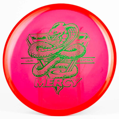 This Latitude 64 Mercy is made with premium grade Opto plastic and features a Lauri Lehtinen Signature snake stamp. Latitude 64's Opto plastic is a translucent plastic that is highly durable and still has decent grip. These discs are highly domey and will glide forever which makes them ideal to use as a driving putter. Personally I didn't like the feel of them when throwing forehand, but for backhand these are a delight to throw. Plus, who wouldn't want to show off that awesome stamp? Pick up one of these Latitude 64 Opto Mercys while we have them!
