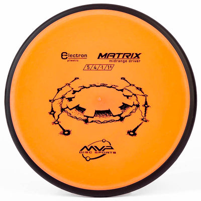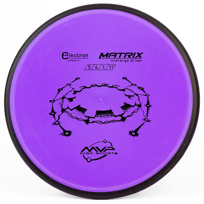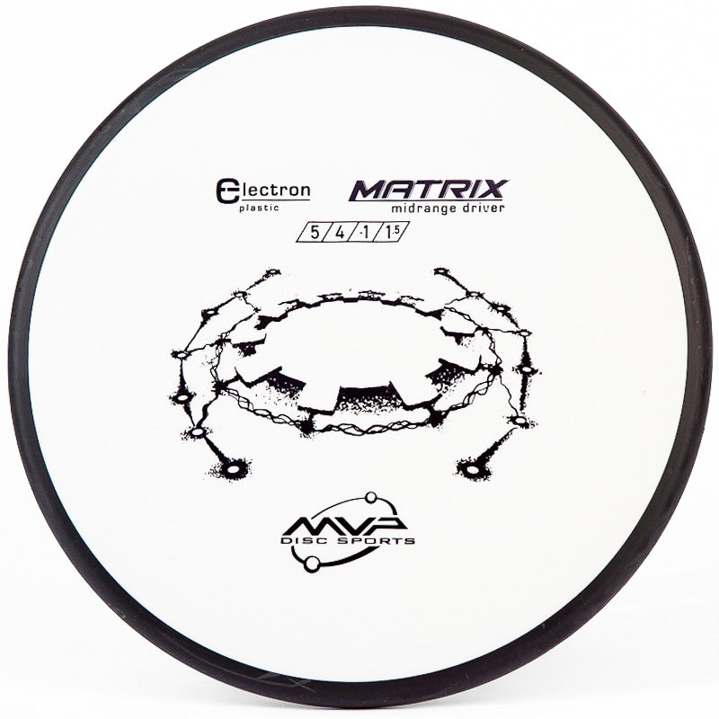 The MVP Matrix (Electron) is a stable to slightly overstable disc golf midrange that is made with grippy baseline plastic. MVP's Electron plastic is perfect for players who need additional grip if they find their hands slipping often. The added grip is a tradeoff for decreased durability as this is a baseline plastic and will wear much faster than premium plastics. If you want to throw one of the grippiest midranges on the market then pick up an MVP Electron Matrix.