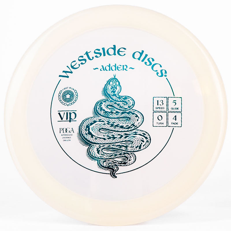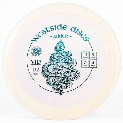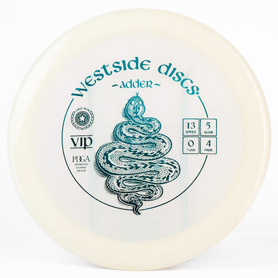 The Westside Discs Adder in VIP plastic is a highly overstable disc golf distance driver that is ideal for advanced players. Westside's VIP is a slightly gummy and incredibly grippy premium plastic that can withstand a ton of damage.