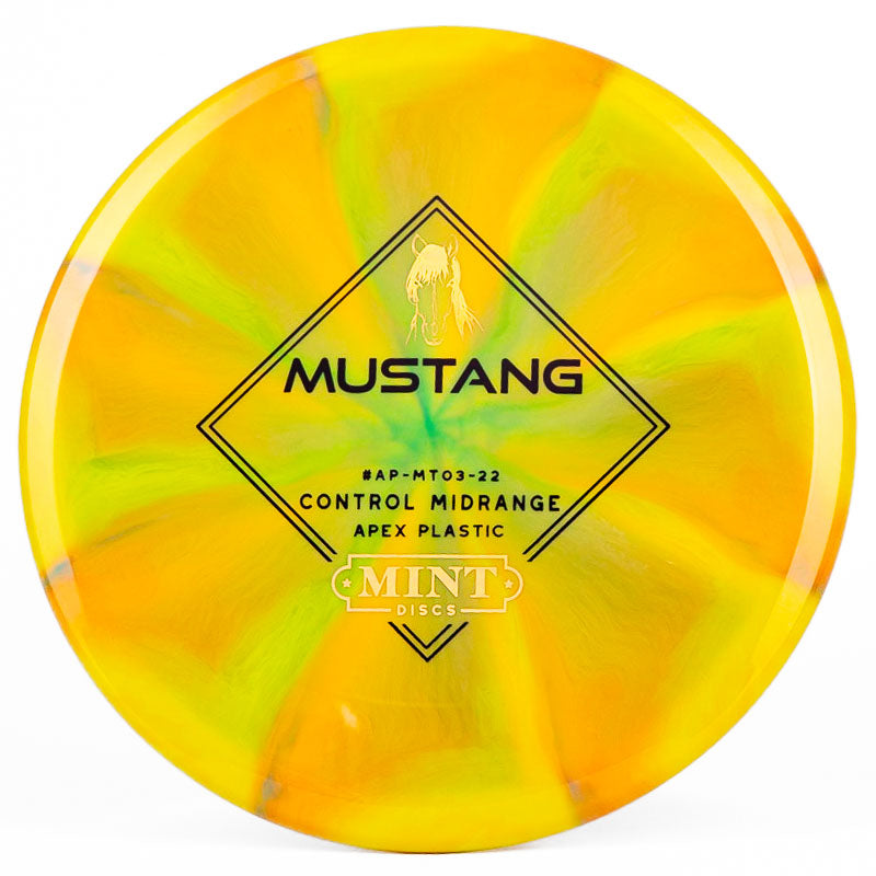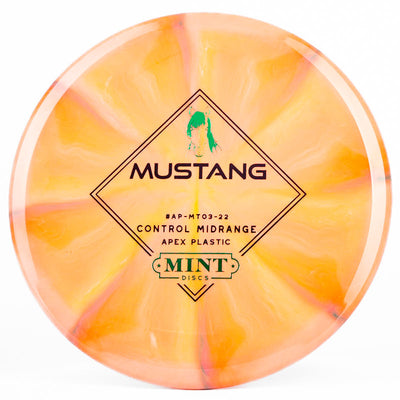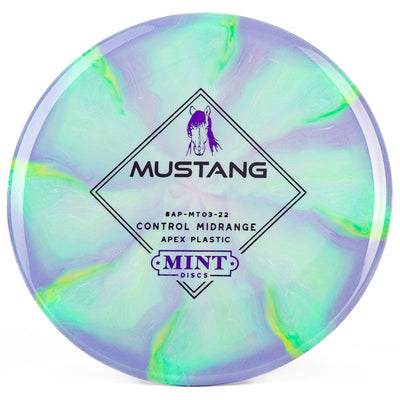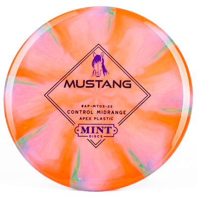 The Mint Discs Mustang (Apex) is a stable disc golf mid range made with premium plastic that comes in gorgeous, swirly colors. The Apex Mustang is a straight flying midrange disc that has a little bit of predictable fade as it starts to slow down. This is an awesome disc to learn how to throw forehand with since its stability has a little bit of torque resistance that will allow you to throw it relatively hard without it turning over. If you need a workhorse midrange made with premium plastic then the Mint Discs Apex Mustang is your new best friend!