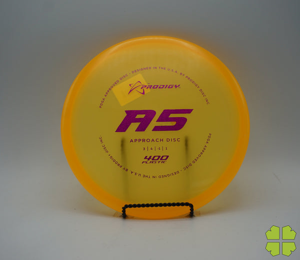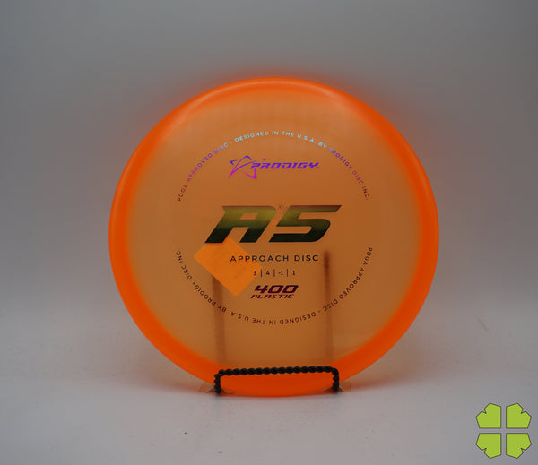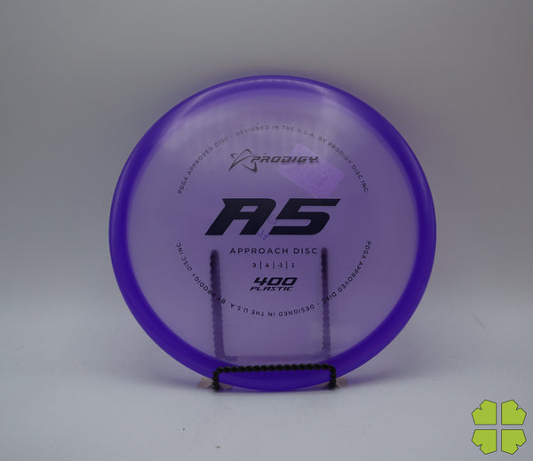 The Prodigy A5 is a slightly overstable approach disc that will work in to be a straight flyer. It has a nice, smooth feel with a shallow profile and flat top, which makes it ideal for sidearm approaches. It can handle torque well and has a mild finish on the end, so it won't skip too far from where it lands.