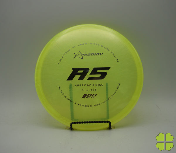 The Prodigy A5 is a slightly overstable approach disc that will work in to be a straight flyer. It has a nice, smooth feel with a shallow profile and flat top, which makes it ideal for sidearm approaches. It can handle torque well and has a mild finish on the end, so it won't skip too far from where it lands.