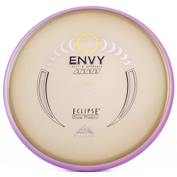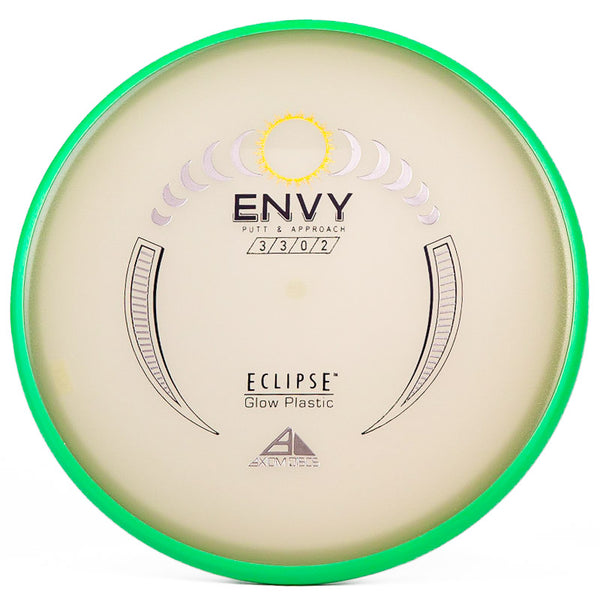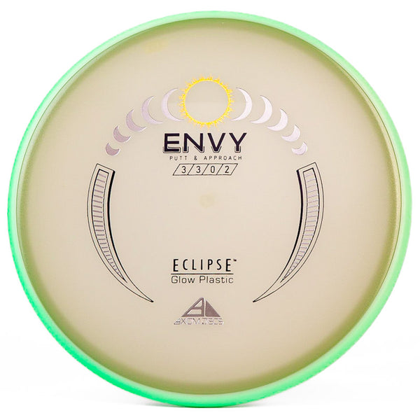 The Axiom Glow Envy is quite possibly the brightest glow in the dark putt & approach disc on the market. In Axiom's Eclipse Glow plastic the Envy has a little more fade, which is perfect for approach shots during your night round. Eclipse plastic is also very grippy, so if you want to bang some chains with this putter you can do it with ease. The added stability and fade makes this putter a phenomenal forehand disc for those technical, precise upshots. As a highly useful approach disc, throwing putter, or putting putter; you honestly can't go wrong with this Axiom Eclipse Glow Envy!
