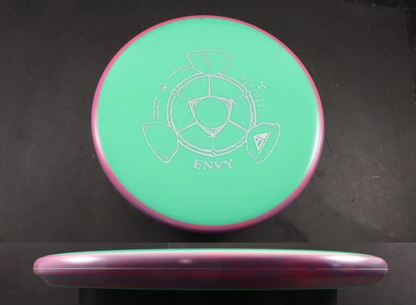 The Axiom Envy in Neutron plastic offers a durable, premium feel paired with bright, opaque color options that stand out on the course. Neutron’s balanced stiffness and grip give the Envy a clean, confident release, making it one of the most reliable throwing putters in disc golf. Its stable, torque-resistant flight makes it equally comfortable for driving, approaching, and confident forehand work.