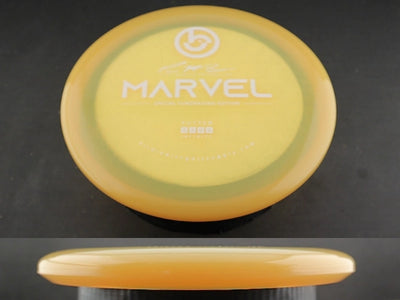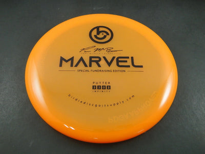 The Marvel flies straight with minimal fade, providing a true point-and-shoot flight for precise putting and approach control. It holds the line on gentle drives and upshots, finishing softly and predictably. The Signature Infinity plastic gives it a slightly firmer feel and exceptional durability, allowing it to maintain its flight characteristics round after round.