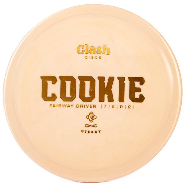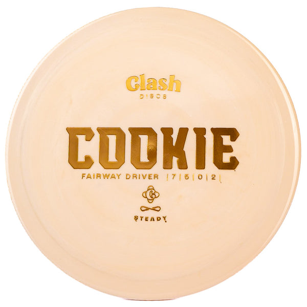 The Clash Discs Steady Cookie is a straight-to-stable fairway driver that offers a consistent and reliable flight path. Designed with just enough torque resistance, this disc is perfect for both backhand and forehand players. Made from premium Steady plastic, it provides a flexible, grippy, and durable feel. With flight numbers of 7/5/0/2, the Steady Cookie holds different lines easily and offers great control.
