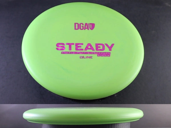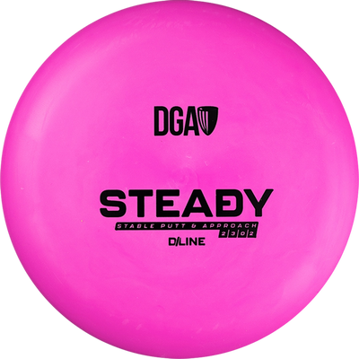 The DGA Steady in D-Line plastic is a beaded putter that offers a perfect balance of stability, touch, and consistency. Designed to honor disc golf’s founder, “Steady” Ed Headrick, this putter lives up to its name — dependable and true on every release. With a stable flight and predictable fade, the Steady delivers confidence both on the green and for controlled approach shots.