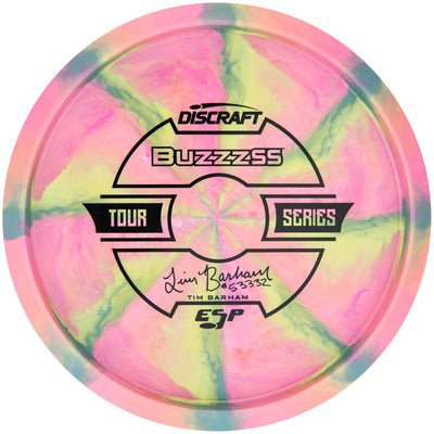 The Discraft Buzzz SS in Tour Series ESP plastic elevates this smooth-turning midrange with a premium, tour-supporting blend known for outstanding grip, enhanced durability, and stunning swirled color patterns. Tour Series ESP offers a slightly firmer feel and added stability compared to standard ESP, giving the Buzzz SS a cleaner release and a more consistent flight that touring pros can rely on. Every purchase helps support the featured pro player.