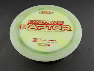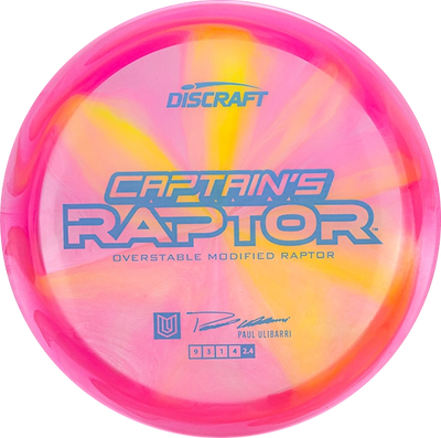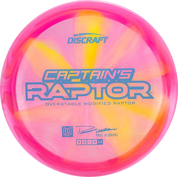 In Z Swirl plastic, the Captain’s Raptor delivers a flat, force-over flight with no turn and a heavy fade. It’s designed for players who need a disc that can handle full-power forehands, spike hyzers, skip shots, and headwind drives without flinching. The stiff feel enhances control and gives the disc a crisp release on both backhand and forehand lines.