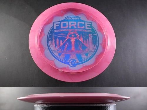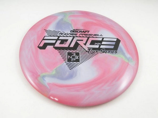 The Discraft Force in Signature Tour Series ESP plastic takes this renowned overstable distance driver and pairs it with one of Discraft’s most premium, tour-supporting blends. Tour Series ESP features bold swirls, enhanced grip, and a slightly firmer feel than standard ESP, giving players a confident handhold and consistent, high-performance stability. This run is crafted to meet the demands of touring pros—capable of handling elite power, harsh winds, and torque-heavy releases without losing its line.