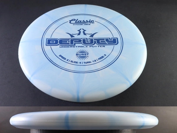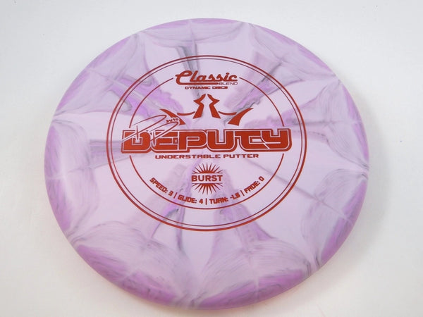 The Classic Blend Burst Deputy pairs dependable putting performance with eye-catching Burst color patterns for a disc that feels as good as it looks. Made from Dynamic Discs’ Classic Blend plastic, it offers the perfect middle ground between firmness and flexibility — providing a tacky, comfortable grip and a smooth, consistent release every time you putt.
