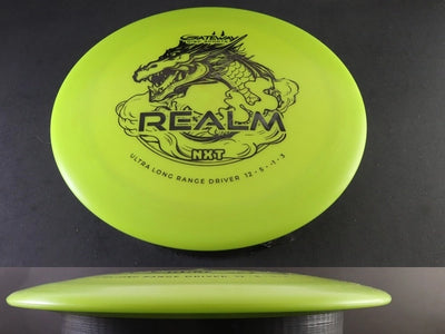 The Realm launches fast with impressive glide and a touch of high-speed turn, finishing with a smooth, forward-pushing fade. It excels at long hyzer-flip distance shots, controlled flex lines, and reliable straight drives that hold their line under power. In NXT plastic, the Realm feels smooth and secure in the hand while maintaining its stability over time, making it a versatile choice for both backhand and forehand power throwers.