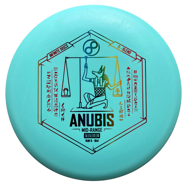 The Infinite Discs Anubis in D-Blend plastic delivers this fan-favorite straight midrange in a grippy, baseline blend ideal for touch, control, and quick seasoning. D-Blend offers a soft, tacky feel that grabs the chains and provides excellent release consistency—perfect for players who want maximum grip or a midrange that beats in to an even straighter, more workable flight.
