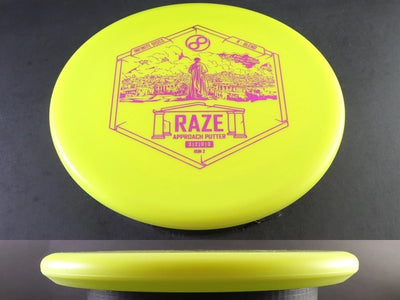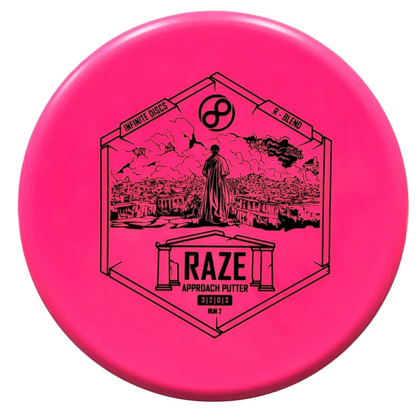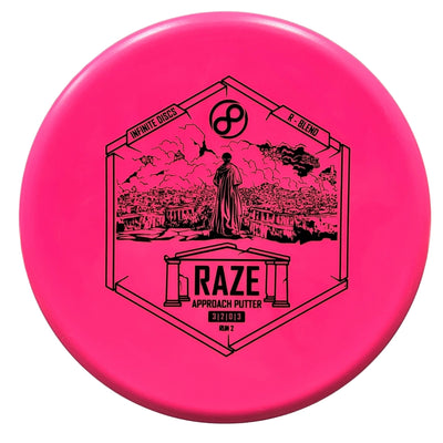The Infinite Discs Raze in R-Blend plastic delivers this flat-topped, overstable approach putter in a grippy baseline blend perfect for touch shots and confident control. R-Blend offers excellent hand feel with a tacky, slightly flexible profile that helps the disc sit down quickly on landing. This makes the Raze especially effective for approaches where you need a predictable fade and minimal ground play.