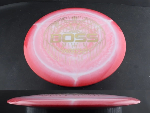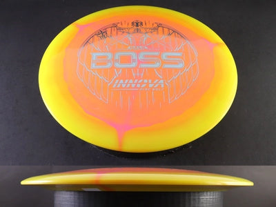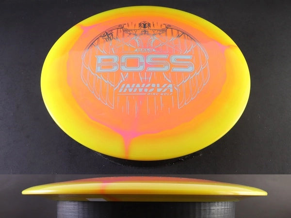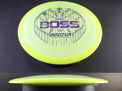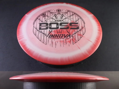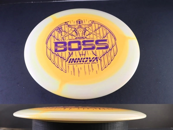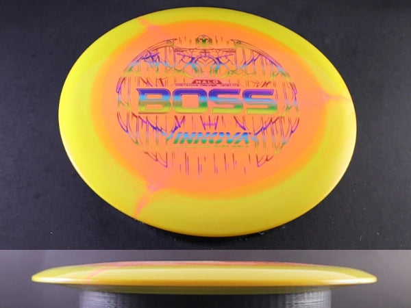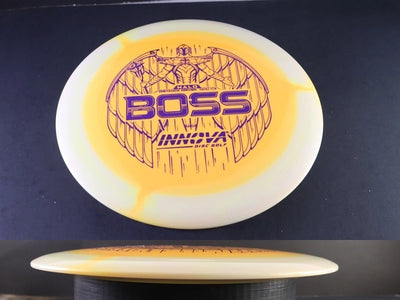 The Halo Star Boss by Innova is a high-speed distance driver built for players who demand maximum power and control. Halo Star plastic offers a firmer, more durable feel with added stability compared to standard Star runs, giving the Boss unmatched torque resistance and consistent fade for confident, full-power throws.