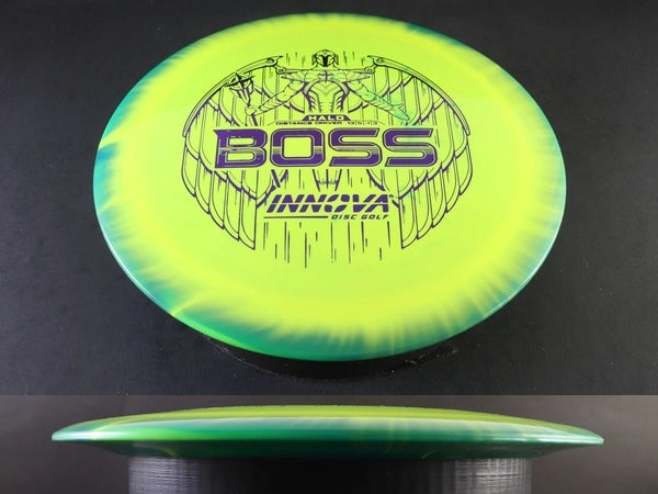 The Halo Star Boss by Innova is a high-speed distance driver built for players who demand maximum power and control. Halo Star plastic offers a firmer, more durable feel with added stability compared to standard Star runs, giving the Boss unmatched torque resistance and consistent fade for confident, full-power throws.