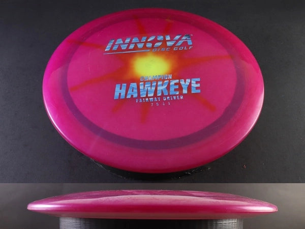 At speed the Champion Dyed Hawkeye flies straight with a touch of high-speed turn and a clean, forward fade. The durable Champion plastic ensures long-lasting stability, while the factory dye patterns make each disc one-of-a-kind, combining performance and personality in one package.