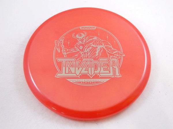 The Innova Invader in Luster plastic gives this straight-flying, low-profile putt & approach disc a premium upgrade with added stability and a slick, pearly finish. Luster plastic is a stiffer, more durable variant of Champion, offering a firm feel and exceptional resistance to wear. This blend tends to produce a slightly more overstable Invader, making it ideal for players who want dependable fade, clean torque resistance, and a putter they can lean on for driving and approach work.