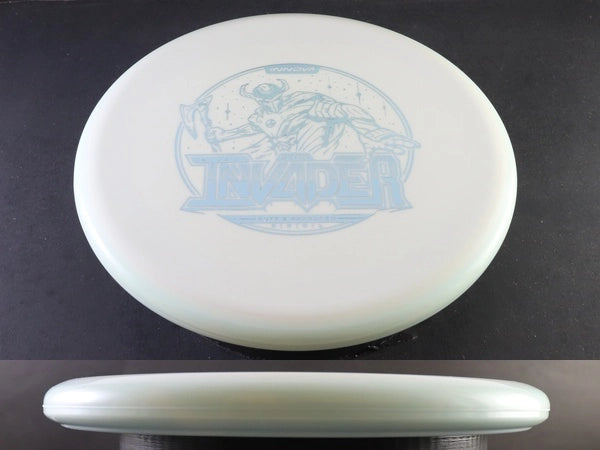 In Star plastic, the Invader holds a straight line with minimal glide and a gentle, predictable fade. It resists turn when thrown firmly, making it great for low-ceiling drives and approach shots where accuracy matters more than distance. The low glide keeps it from sailing long, while the subtle fade helps it settle reliably near the target.