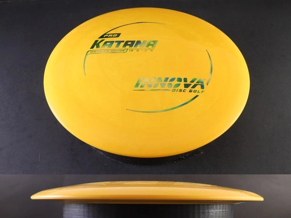 The Pro Katana by Innova delivers explosive distance with a grippy, flexible feel that helps generate effortless power. Crafted from Pro plastic, it offers enhanced glide, a touch more understability than premium blends, and a comfortable texture that seasons into even longer, more workable flights. Designed for massive turnover shots and long-distance flex lines, the Pro Katana is one of the easiest high-speed drivers to throw far.