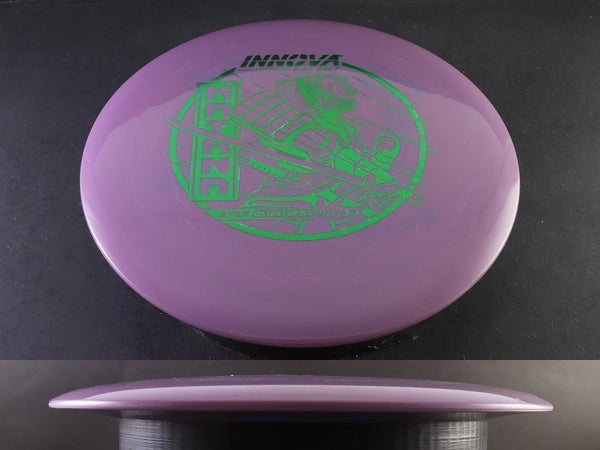 The Star Katana by Innova is a high-speed distance driver built for massive distance potential and dramatic flight movement. Star plastic delivers a perfect blend of durability, grip, and consistency, giving the Katana a reliable feel for players who want big turn, huge glide, and a strong fade at the finish.