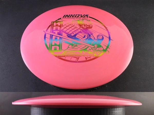 The Star Katana by Innova is a high-speed distance driver built for massive distance potential and dramatic flight movement. Star plastic delivers a perfect blend of durability, grip, and consistency, giving the Katana a reliable feel for players who want big turn, huge glide, and a strong fade at the finish.