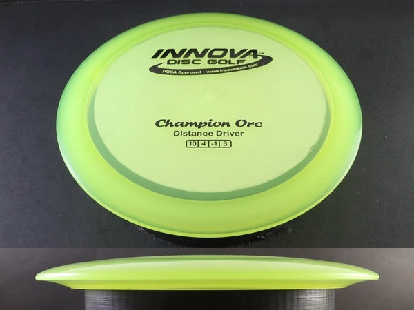 The Champion Orc by Innova is a stable distance driver designed for control, power, and consistency. Made from premium Champion plastic, it offers a stiff, durable feel that maintains its flight characteristics throw after throw. Known for its blend of speed, glide, and reliability, the Champion Orc performs exceptionally well in windy conditions while delivering long, accurate flights.