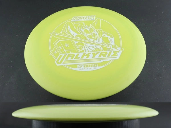 At speed the DX Valkyrie hyzer-flips to flat, glides beautifully down the fairway, and finishes with a gentle fade. As it wears, it becomes straighter and eventually develops into a dependable understable flyer—perfect for long turnovers, tailwind drives, or smooth hyzer-flips through tight gaps.