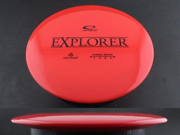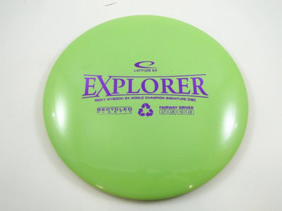 The Latitude 64 Explorer in Recycled plastic offers the familiar straight-to-stable control of the Explorer mold in an eco-friendly blend made from reprocessed premium plastics. This version has a slightly softer feel and a touch more grip than Opto or Gold, making it comfortable in the hand and easy to trust on controlled fairway lines.