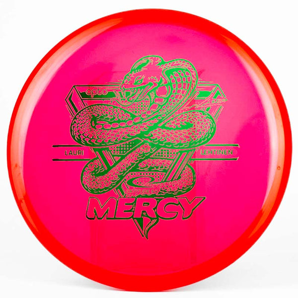 This Latitude 64 Mercy is made with premium grade Opto plastic and features a Lauri Lehtinen Signature snake stamp. Latitude 64's Opto plastic is a translucent plastic that is highly durable and still has decent grip. These discs are highly domey and will glide forever which makes them ideal to use as a driving putter. Personally I didn't like the feel of them when throwing forehand, but for backhand these are a delight to throw. Plus, who wouldn't want to show off that awesome stamp? Pick up one of these Latitude 64 Opto Mercys while we have them!