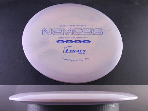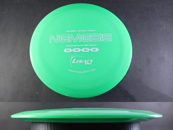 The Legacy Nemesis is a massively understable driver with a strong finish. If you're looking for a Legacy disc that will easily turn over but finish the flight with a strong fade, the Nemesis may provide your answer. Legacy claims that this disc was was designed for longer fairway shots, and will fit the gap between the Cannon and the Patriot.