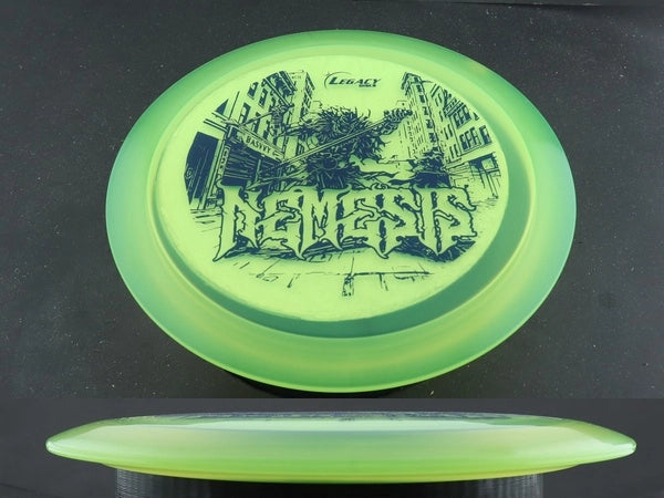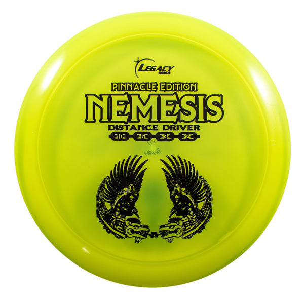 The Legacy Nemesis is a massively understable driver with a strong finish. If you're looking for a Legacy disc that will easily turn over but finish the flight with a strong fade, the Nemesis may provide your answer. Legacy claims that this disc was was designed for longer fairway shots, and will fit the gap between the Cannon and the Patriot.