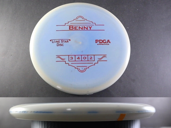 The Lone Star Disc Benny is a straight-to-stable putter with a bead that perfectly complements the Penny Putter. It offers a dependable and straight flight path with a predictable fade, making it a great throwing putter.