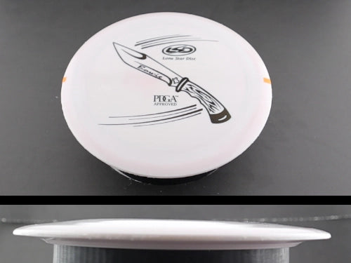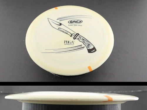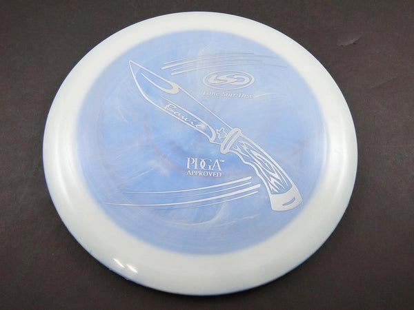 The Bowie is Lone Star's first distance driver. This is a fast overstable disc, designed to handle power. It will fly very straight with a little turn and a nice fade at the end. This is a great disc for power throwers, windy shots, forehand throws, and strategic doglegs.