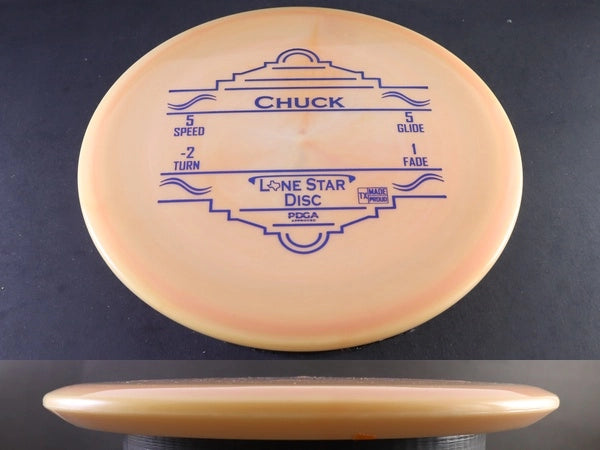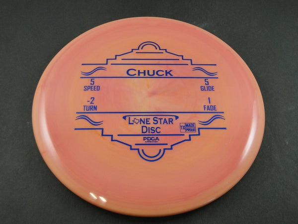 The Chuck by Lone Star Disc is a semi-understable midrange with a controllable turn and a gentle fade. It is great for straight throws and hyzer flips.
