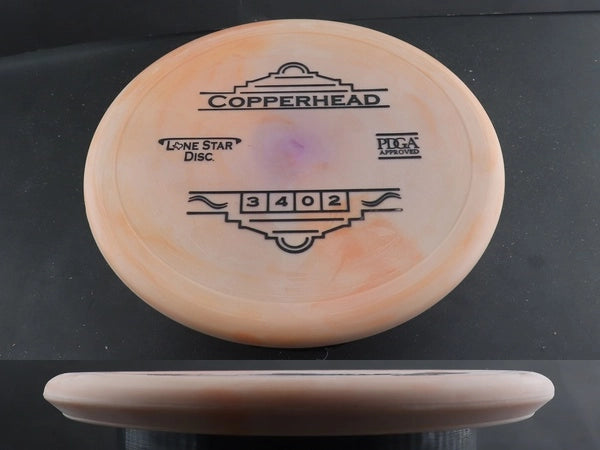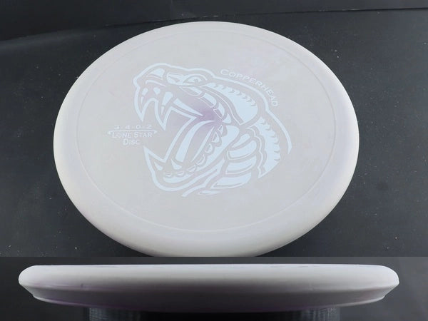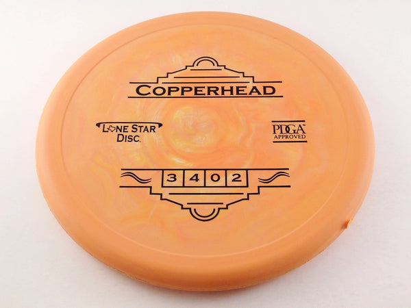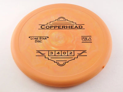The Copperhead, by Lone Star Disc, is an overstable approach disc with a thumb-track on top of a very flat disc. It is a beaded, slow-speed disc that is great for control into headwinds or for moving around obstacles on the course.