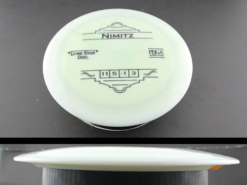 The Lonestar Nimitz is a stable to overstable disc golf driver. Named after the Fredericksburg native Chester Nimitz, the Nimitz is a disc that fits perfectly between the Curl and Warbird. This Distance Driver from Lone Star Disc has a slight turn and finishes with a reliable fade at the end of its flight. It can handle the power of experienced throwers, yet is not too fast for most players.