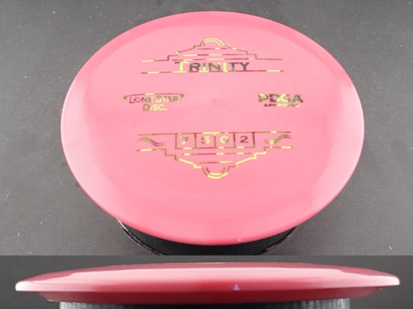 The Trinity by Lone Star Discs is a slightly overstable fairway driver designed to fit seamlessly between the Frio and Brazos. This disc is capable of handling torque and offers a reliable finish at the end of its flight, making it a dependable choice for various shot types.