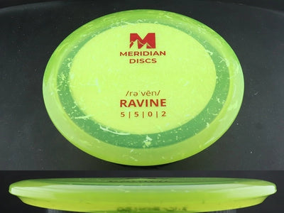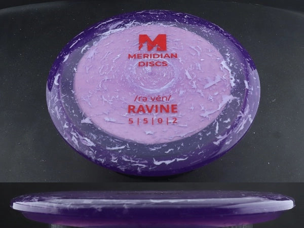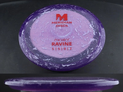 The Meridian Discs Ravine in Marbled Clarus plastic is a stable-to-understable midrange designed for effortless control, smooth glide, and precision line shaping. Built to hold any angle you release it on, the Ravine excels at straight shots, gentle turnovers, and controlled approaches that demand touch and accuracy. The Marbled Clarus plastic combines premium durability and grip with stunning swirl patterns, providing both top-tier performance and eye-catching style on the course.