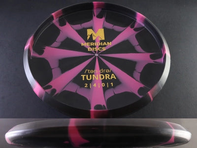 The Meridian Discs Tundra in Marbled Graphite plastic is an overstable control driver built for precision, consistency, and dependable fade. Designed to handle torque and wind with ease, the Tundra is the perfect choice for forehand throwers, flex lines, and placement shots that demand control over distance. The Marbled Graphite blend provides a stunning swirled appearance with a premium, grippy texture that combines durability, stiffness, and smooth release in all conditions.