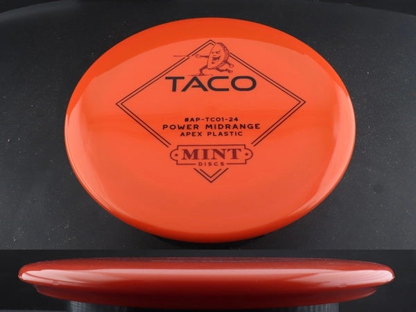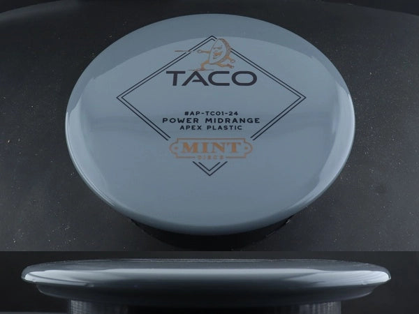 The Mint Discs Taco in Apex plastic brings this uniquely workable midrange into Mint’s premium, tour-grade blend. Apex offers a smooth, slightly firm feel with excellent grip and long-lasting durability, giving players a confident release whether they’re throwing touchy woods shots or powering up into open fairways. The Taco’s rounded profile and versatile stability make it a standout do-everything mid that feels great in the hand.