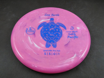 The Ocean Discs Sea Turtle is a straight-flying, glidey putter crafted from Ocean Waste Swirly Pacific plastic — a premium blend made using recycled marine plastic. This eco-conscious material gives the disc a smooth, grippy feel and a unique, swirled finish that makes every disc one of a kind.