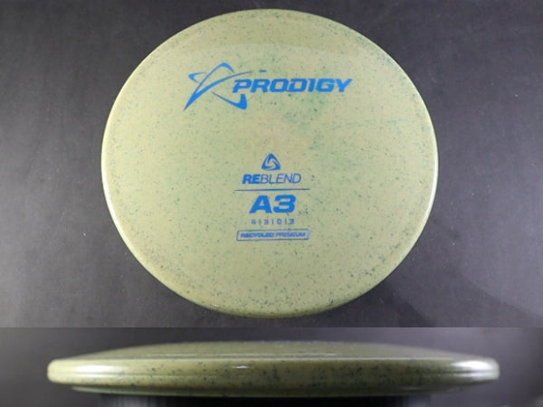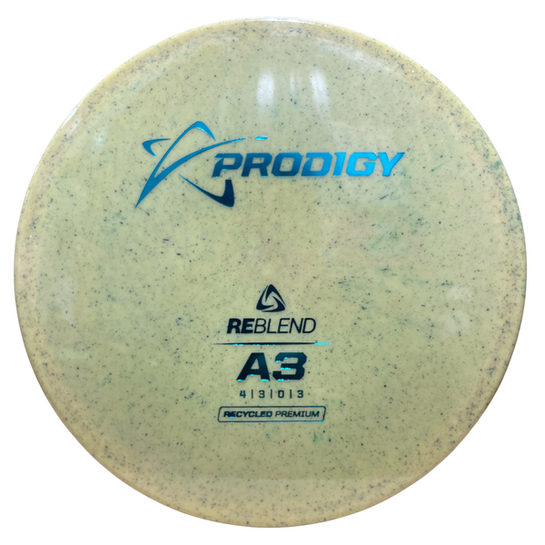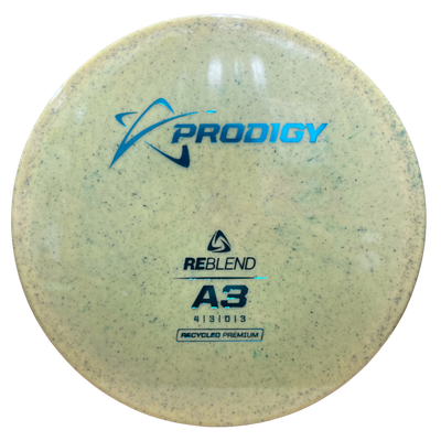 The Prodigy A3 in ReBlend plastic is a reliably overstable approach disc designed for players who want clean control with an eco-friendly twist. The A3 sits comfortably between the A2 and A4 in stability—offering a strong, workable fade that holds up to power without being overly dumpy. In ReBlend, Prodigy’s recycled-content plastic, the mold gains slightly softer grip, excellent touch, and a more environmentally conscious construction while maintaining the dependable stability players expect from an A3.