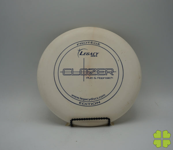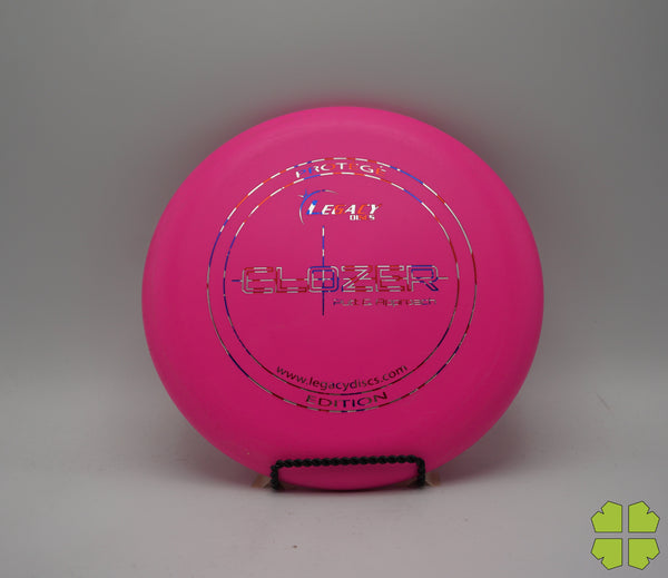 The Clozer is a straight flying, low speed disc that has fade at the end of its flight. This disc can be a stable short range driver or a putt and approach disc. It was designed to give a player the edge for a short range drive, upshot, or putt into a head wind.