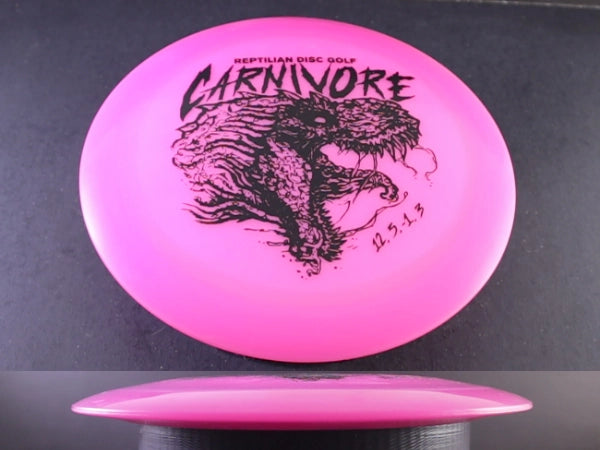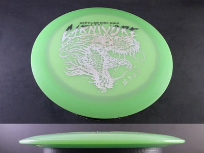 The Reptilian Disc Golf Carnivore in Amber plastic is a fast, overstable distance driver built for power throwers who demand control and consistency. Designed to shred through headwinds and hold up to torque, the Carnivore delivers long, dependable flights with a strong, predictable fade. The Amber blend combines premium durability with a tacky, semi-flexible feel that gives players confident grip and lasting stability, even after heavy use.